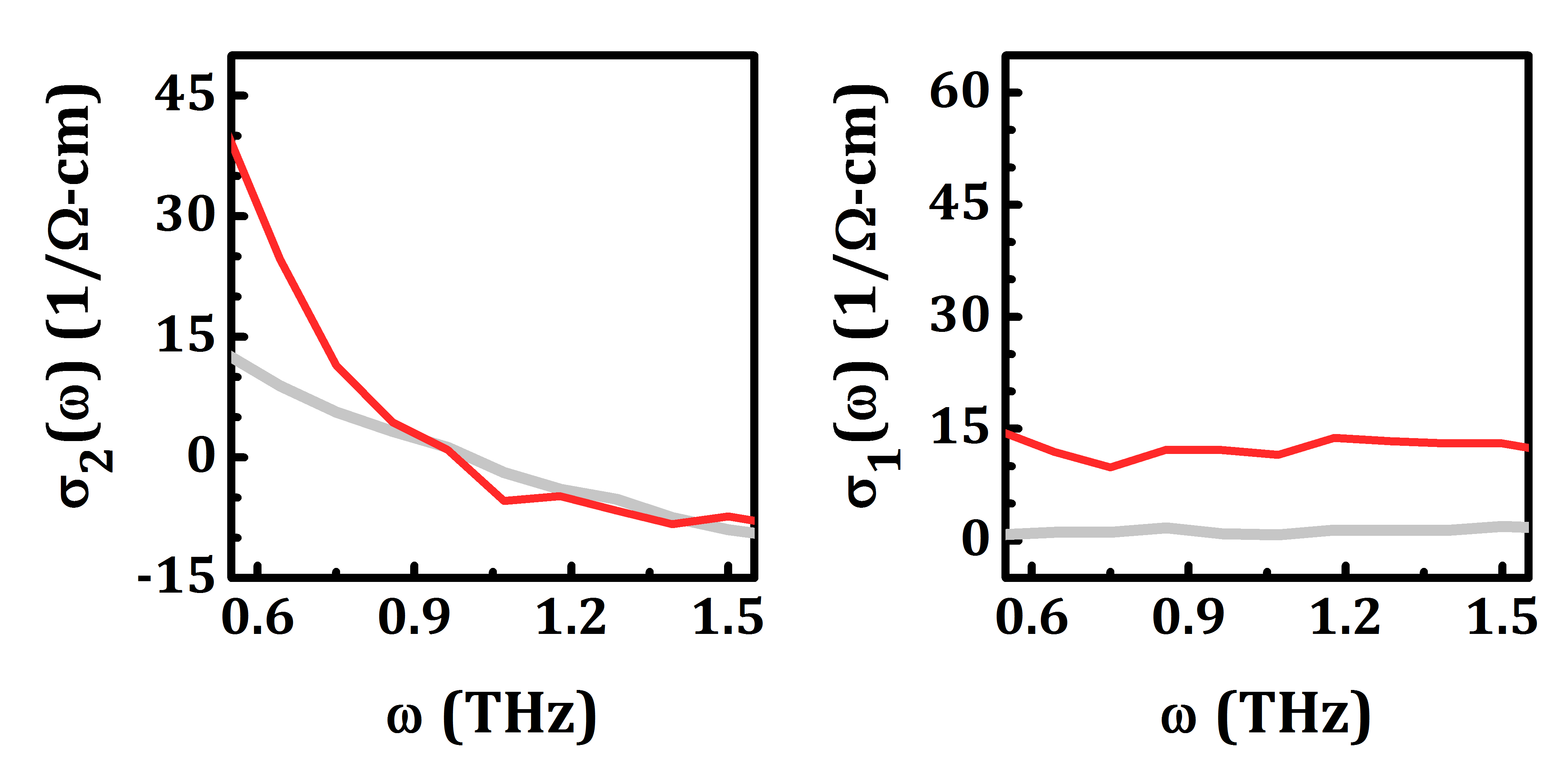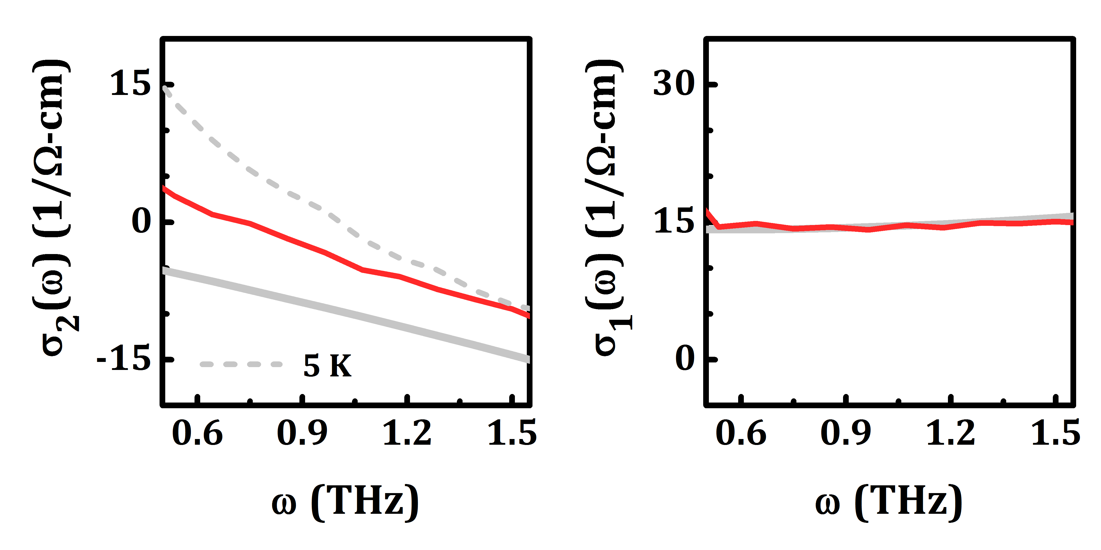 YBCO 6.5, 5 K. In equilibrium (grey), the inductive conductivity σ2(ω) (left) shows a positive, divergent component due to superconductivity. The Ohmic conductivity σ1(ω) (right) is gapped in this frequency regime. After light excitation (red), the inductive response increases and the Ohmic response remains gapped.