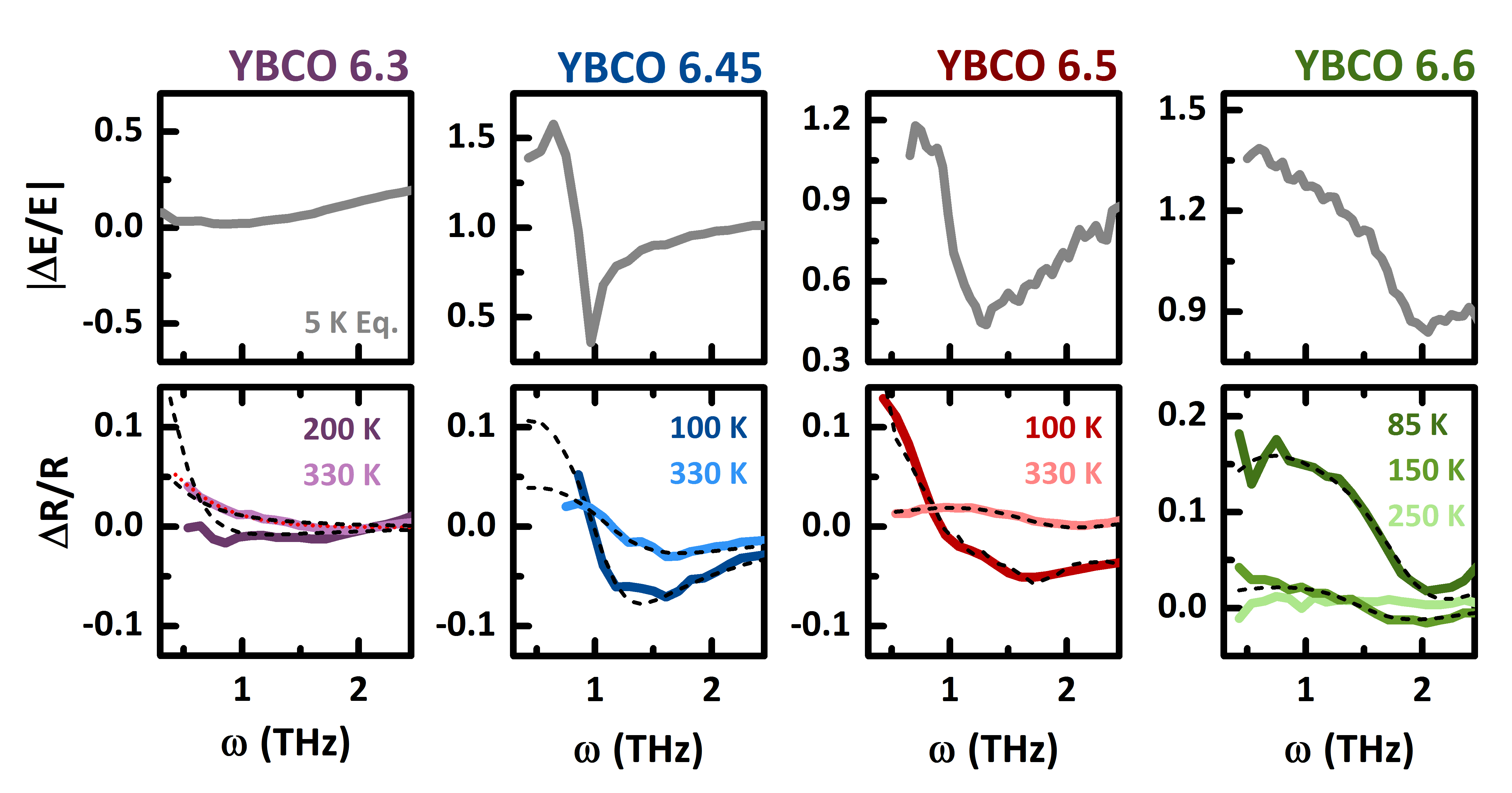 YBCO x at 4 dopings, non-superconducting x = 6.3 and superconducting x = 6.45, 6.5, and 6.6. Top row: The equilibrium reflectivity at 5 K, showing a sharp Josephson plasma edge. Bottom row: The light-induced plasma edge above Tc.