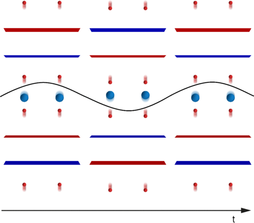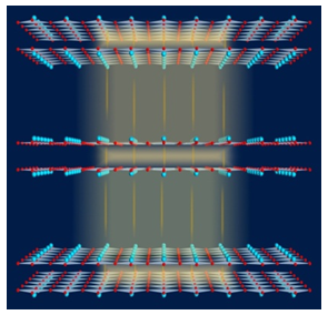 Representation of the YBCO crystal structure, illustrating the Matthey model. The copper oxide layers are shown as red and blue planes, and some of the atoms in the insulating layers are shown. The apical oxygen motion results in an external potential on the CuO2 layers that is periodic in time and staggered along the c-axis, represented by the red and blue coloring.