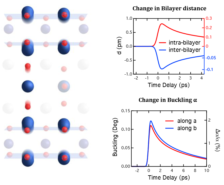 Measurements led by Roman Mankowsky and Alaska Subedi found that the distance between the planar Cu atoms and the apical oxygen decreases after excitation, seemingly in contrast to what one would expect for enhanced superconductivity. However they also find that the buckling of the planar Cu-O bonds increases, with the Cu atoms moving into the interbilayer region. The net effect is a decrease in the interbilayer spacing and a corresponding increase in the intrabilayer spacing. Overall the measured displacements were quite small, on the scale of a pm. However, as the Josephson coupling scales exponentially with the distance between the planes, these shifts may account for the observed increase (decrease) in interbilayer (bilayer) coupling.