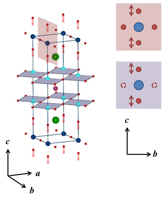 In underdoped compounds, there are two B1u apical oxygen modes, associated with the YBCO 6 and YBCO 7 crystal structures. The pump was made resonant with the mode associated with the YBCO 6 lattice, in which oxygen is missing from the Cu-O chains. (Apical oxygen motion is illustrated in the purple square, right.)